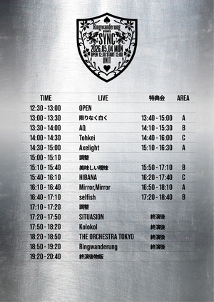 【チケット】 https://t-dv.com/rwr_sync_260504 一般先着販売 4/14(火)21:00 - 5/3(日)23:59 前売チケット 3,000円 |