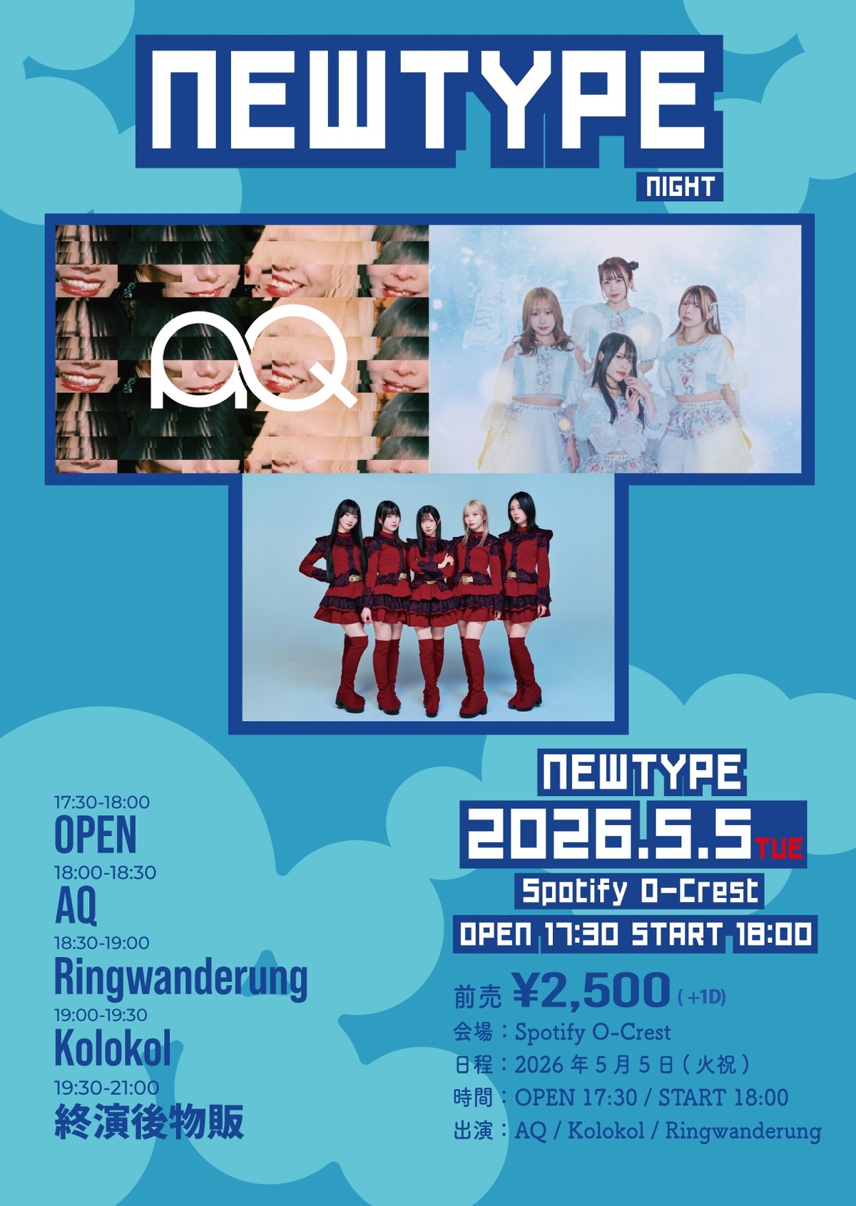 【チケット】 https://t-dv.com/NEWTYPENIGHT_20260505 一般先着販売 4/15(水)21:30〜5/4(月)23:59 前売チケット 2,500円 当日券 3,500円 |